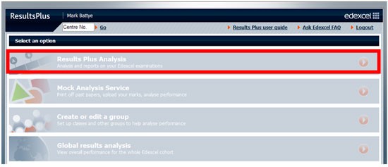 2. Once you are logged in under your centre, select 'Results Plus Analysis'.